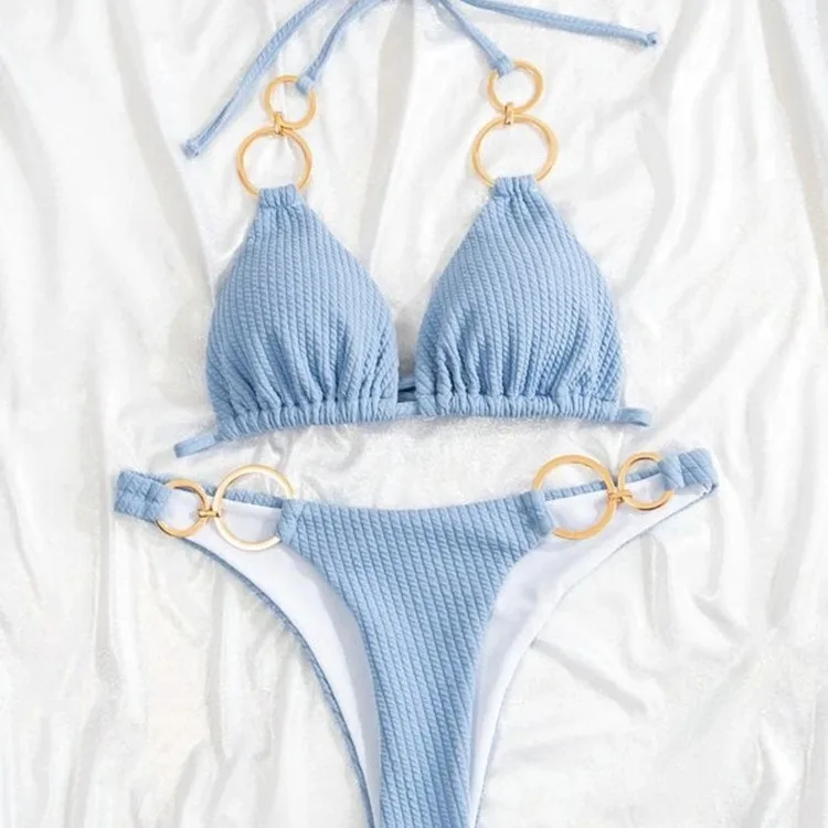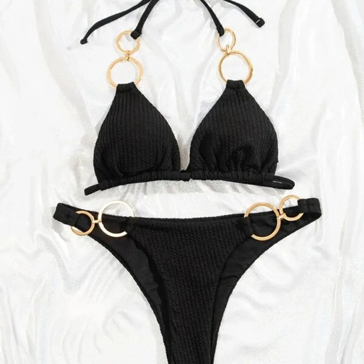 2026 European American Style Cross-Border Thong Bikini Sexy Three-Point Solid Color Backless Underwire Pearls Beachwear